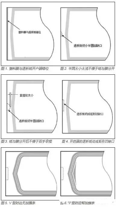 另外,很大一部分醫用紙塑包裝袋,為了輕松地開啟,開啟處的封邊都選擇了V 型封燙(如圖 5)。這樣雖然滿足方便開啟,但在滅菌時,特別是蒸汽滅菌的情況下,容易出現V 型處爆開現象。為了解決這一現象,在V 型的內側凹處增加了一根加強條(如圖6),更能滿足蒸汽滅菌時的需求。  TEL:13912278158